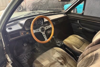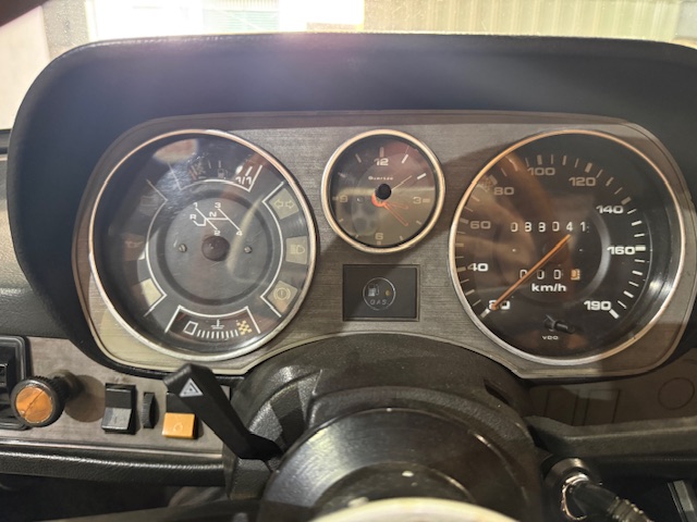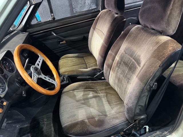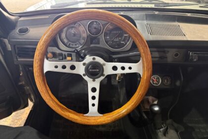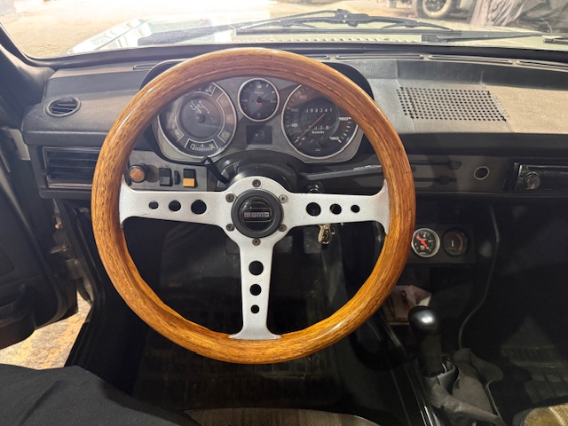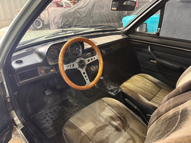 Interior em bom estado, com bancos originais, volante Momo em madeira, instrumentação original.